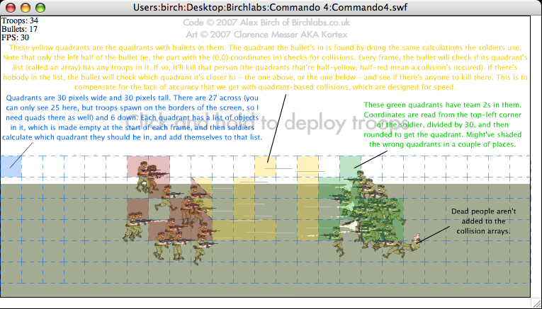 The main problem I saw with Commando 3 (besides the appalling engine) was that the graphics were too intensive to allow any major battles to run well. So I turned to one of the (now old) versions of the Invasion 5 engine for a speed boost. However, it turned out that making a side-on RTS was a stupid, inflexible idea. Sprite work was far too fiddly, and bugs were impossible to catch, with the result being that I abandoned the project. Kortex did the artwork for this prototype, and I feel bad about these animations never seeing the light of day. If I do ever try to make a Commando 4 again, it'll be a top-down RTS for sure, probably with buildings, and it'd use the Invasion 5 sprite engine. If anyone's wondering why I've been so reluctant to embark on such a project, look at the spritesheet linked below... I made that by hand; no code involved. THAT is how many sprites need to be prepared for ONE unit in a top-down game (and of course I need to do it a second time for team two :P). It's not fun at all. And it only works with small units; a sprite sheet for the tank (actually note that I'd need TWO spritesheets - one for the turret, one for the base) would be too big to fit within Flash's 2880x2880 bitmap size limit. It could be spread between several bitmaps, but this is a real pain to do. I also had an explanation of the collision system used in Commando 4 (a derivation of the one used in Invasion 5) lying around, so I've attached that as well.